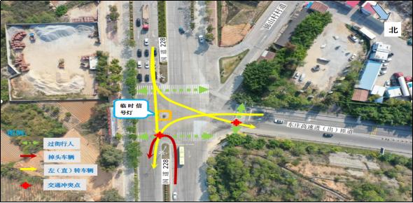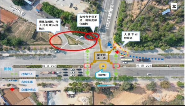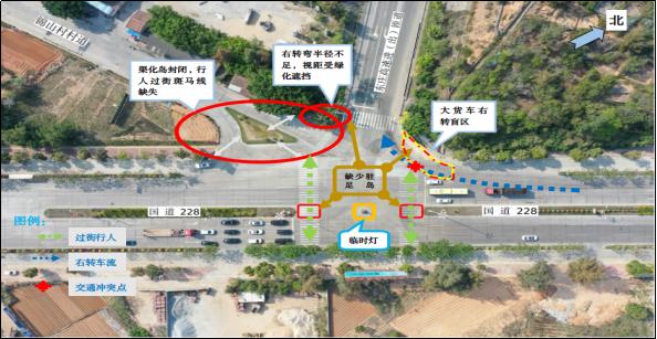 二是交通设施落后导致交通冲突,且缺少电子警察和流量检测系统。路口交通信号灯为临时信号灯,无行人信号灯指引;东进口掉头车辆无序穿插掉头,与其他方向之间冲突明显,存在较大安全隐患。