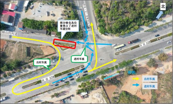 将进口道右侧绿化岛侵占出村道空间的部门进行破除并重新硬化成通车路面,并向下方偏移增设路口渠化岛,保留村道右转通道,提高路口通行便利性。同时配套增设出村口的信号灯相位,指引车辆安全规范出行。
