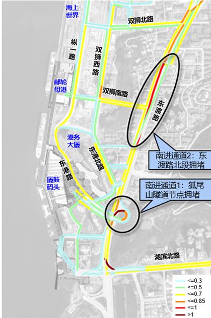 四是节点交通复杂,人车冲突矛盾突出。狐尾山隧道作为南向进入片区的主要节点,交通组织不合理、通行效率低,高峰期易形成交通瓶颈。进入片区的主要路径东港路现状设置过多斑马线,人车混行严重,影响通行效率。