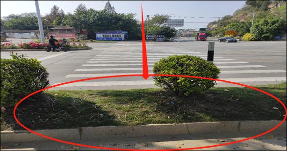 四是人行横道侧分带处无驻足区,行人通行受阻。村口临近路口处设置封闭式渠化式绿化岛(行人无法上岛驻足),绿化带存在盲区安全隐患。