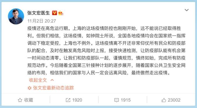 11月2日晚,张文宏发文称,疫情还在高危运行期。上海的这场疫情防控也刚刚开始,远不能说已经取得胜利。但我们相信,这场疫情,如钟南山院士所说,全国各地疫情均会在国家统一指挥调动下稳定受控,上海也不例外。