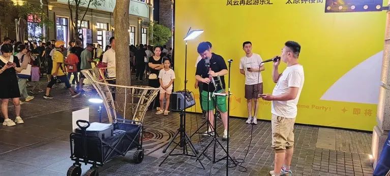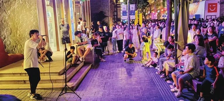 8月12日晚,钟楼街人头攒动分外热闹,一眼看去满满的烟火气。“这位大哥已经准备很长时间,让他为咱们献上一曲。”“大哥,别紧张,对着手机屏幕唱就好!”一家商店旁的空地上,一口“播音腔”的男主播话筒递到一名路人手中,不停地鼓励对方。