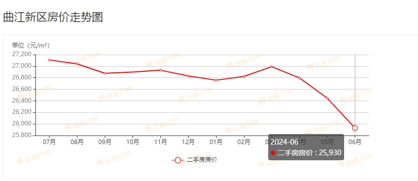 在楼市一向房价坚挺的曲江,今年也时常能看到房价下跌的消息,从房价走势来看,曲江的二手房价格在今年的3月份是最高点,自4月便开始一路下跌,目前整体挂牌均价为25930元/?,已经连跌3个月。