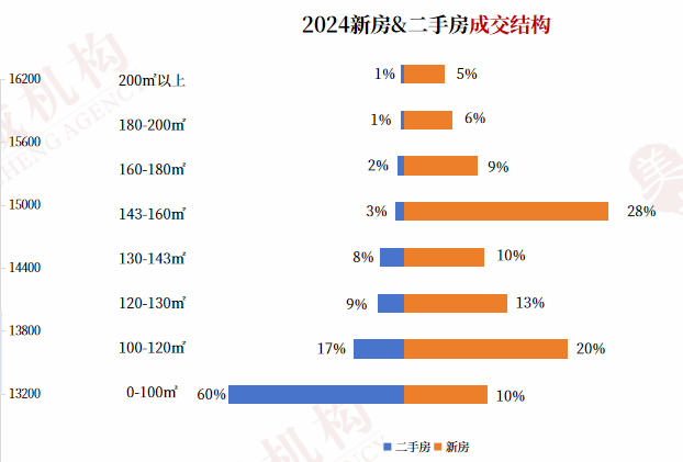 再看下产品情况,二手房房源的面积段基本以90?为界,挂牌主力户型面积为90-140?,其次为60-90?,140?以上的中高端改善及60?以下的小户型,占比有限。