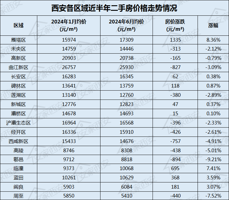 相信不少买房人除了关注总体的行情走势,对各区域的房价情况也相当关注,房博士整理出西安18个区域,近半年的房价走势情况,数据显示截至6月底,西安二手房均价为16303元/?。各板块具体涨跌如下: