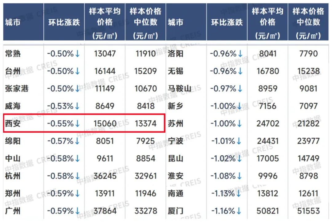 聚焦到西安,6月二手房均价是15060元/?,环比下跌0.55%,跌幅扩大(5月下跌0.53%),行情依旧不乐观。