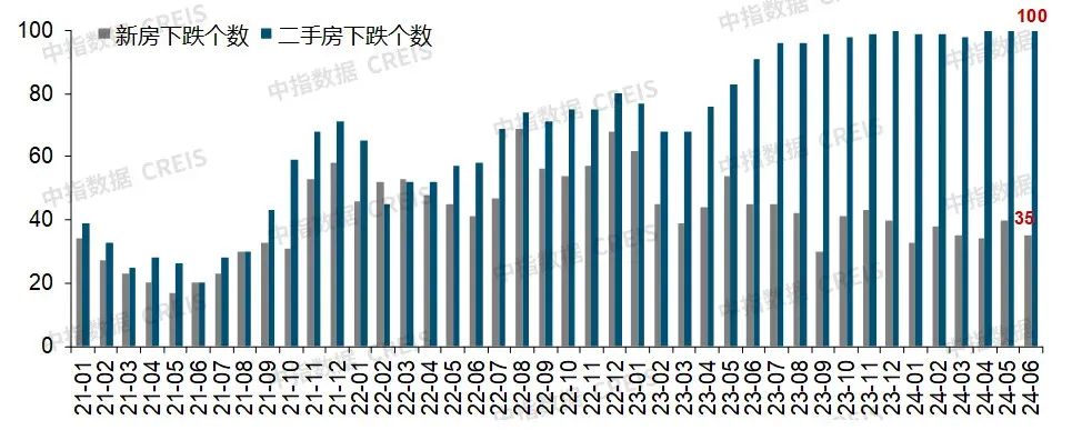 2021年1月至2024年6月百城新建及二手住宅价格环比下跌城市数量