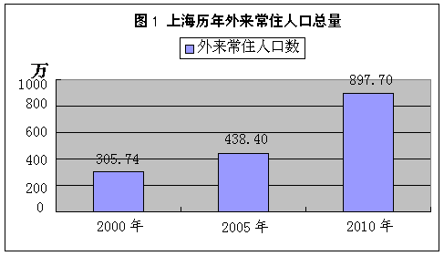 上世纪90 年代初期以来,外来人口已成为上海常住人口增长的主要来源。第五次全国人口普查(以下简称“五普”)资料显示,2000年上海外来常住人口为305.74万人;2005年全国1%人口抽样调查资料显示,截至2005 年10 月31 日,上海外来常住人口达到438 万。而最新第六次全国人口普查(以下简称“六普”)资料表明,截止2010年10月31日,上海外来常住人口总量已猛增至897.7万人,比“五普”增加591.96万人,增长193.6%(见图1)。