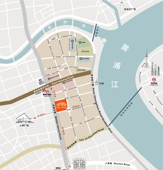 外滩·老市府项目位于外滩历史文化风貌区和外滩金融集聚带的核心区域,四面分别为江西中路、福州路、河南中路和汉口路,距离外滩黄浦江约300米,距离南京东路约200米,距离人民广场1500米,具有得天独厚的区位优势。