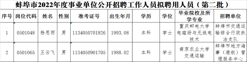 以上是2022年蚌埠市事业单位招聘拟聘用人员公示(第二批)的全部内容,更多资讯请继续查看:安徽华图(https://ah.huatu.com/)、安徽事业单位招聘网(https://ah.huatu.com/sydw/)。