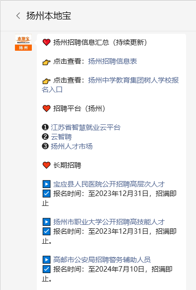 温馨提示:微信搜索公众号【扬州本地宝】,关注后在对话框回复【招聘】可获扬州政府部门|事业单位|国企|社区|大厂招聘汇总、报名入口|公告|条件|材料。