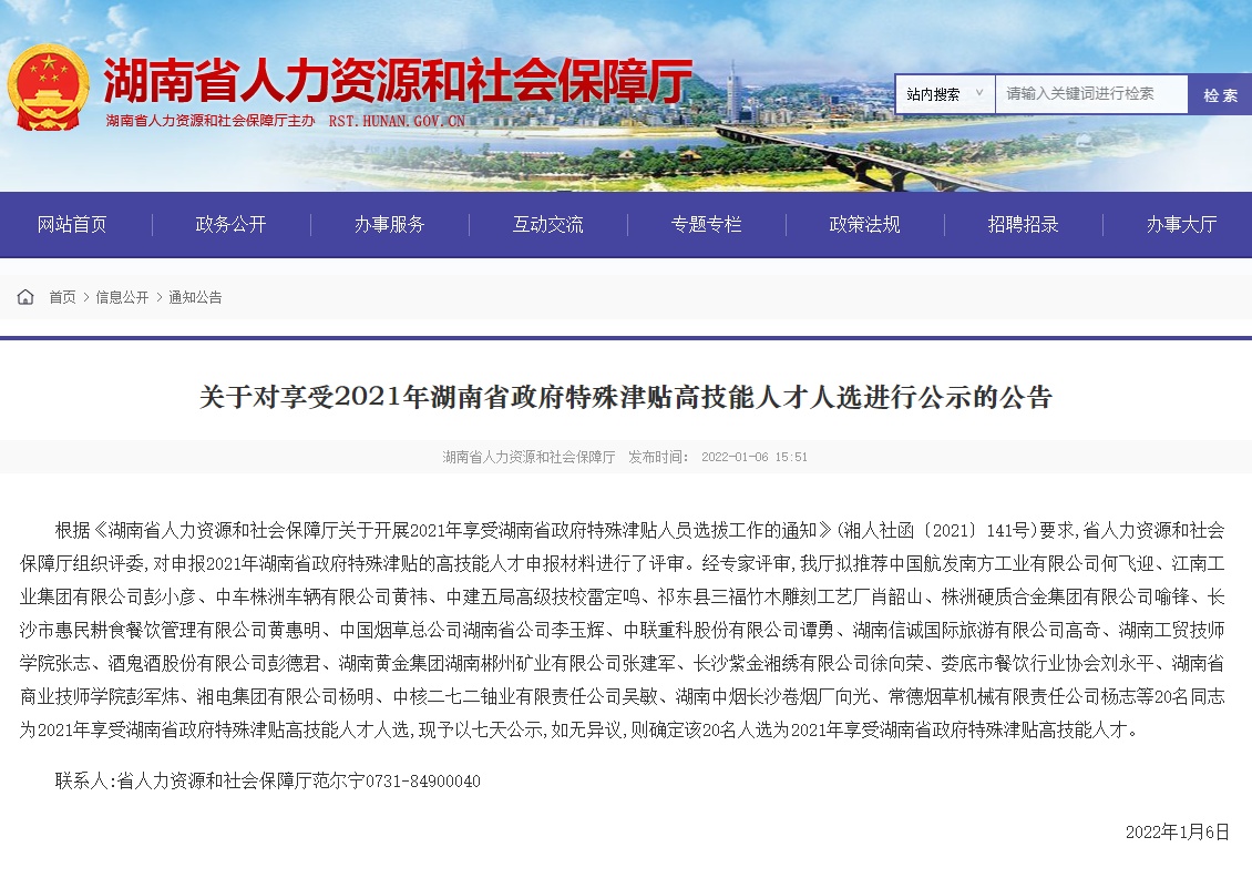 1月6日,湖南省人力资源和社会保障厅公示了2021年享受湖南省政府特殊津贴高技能人才人选,20人榜上有名,公示期为7天。