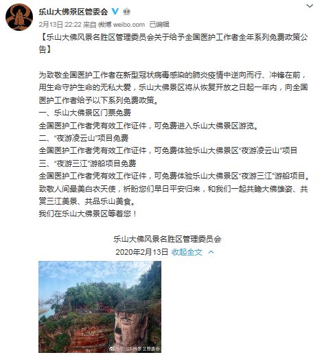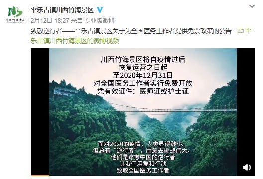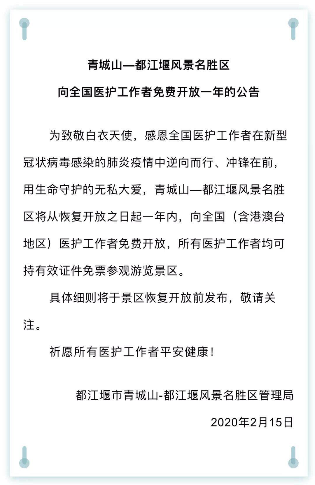 从四川省文化和旅游厅获悉,为致敬奋斗在抗疫一线的医务工作者,截至2月14日17:00时,全省已有百家文化和旅游景区向全国医务工作者发出了疫后免费游四川的“邀约”,邀请他们在景区恢复开放后,全年免门票游览。