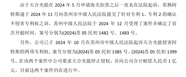 另外,阿特斯也在公告中透露,已于2024年10月在苏州市中级人民法院起诉天合光能侵害阿特斯的两项专利权,案号分别为〔2024〕苏05民初1385号、〔2024〕苏05民初1399号,在该两起案件中公司要求天合光能停止侵权,并向公司合计赔偿人民币1亿元。截至2月11日,上述两个案件仍在进行中。