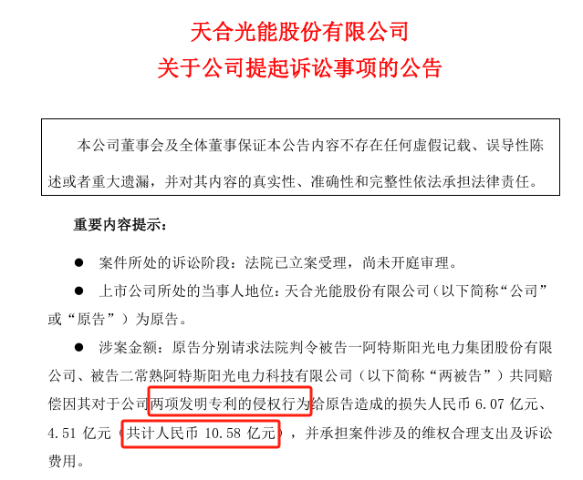 2025年2月10日,天合光能公开了一起专利诉讼案,起诉阿特斯及全资子公司常熟阿特斯阳光电力科技有限公司发明专利侵权,索赔金额超10亿元。