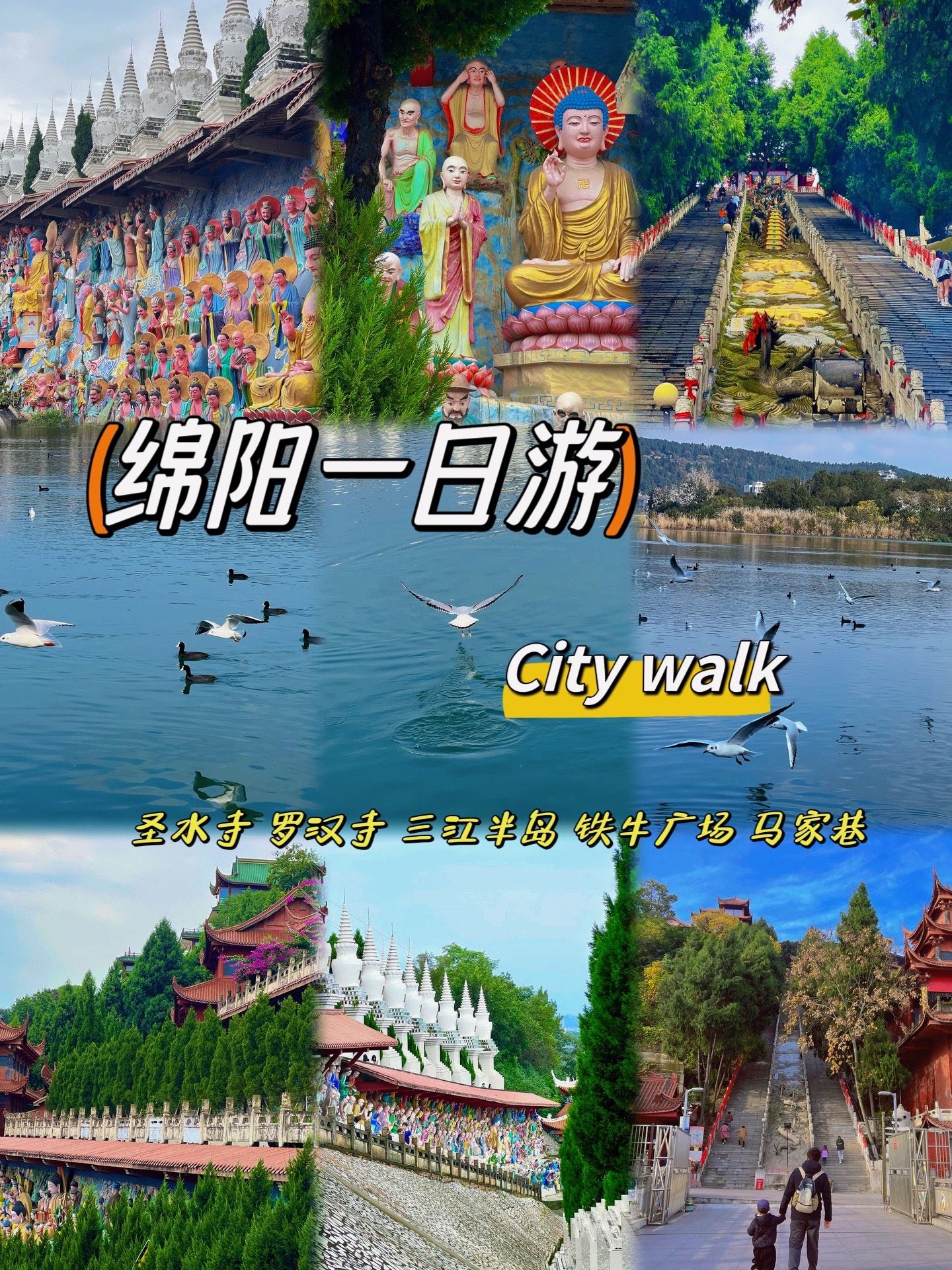City walk路线:圣水寺罗汉寺马家巷三江半岛越王楼富乐山绵阳市博物馆返程