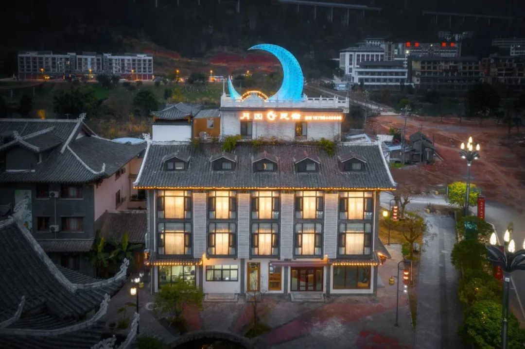 民宿坐落于荔波古镇樟江河畔、依山傍水。月园在青砖黛瓦、飞檐翘角的建筑之顶以中国红的“斗冠”造型悬挑出檐、榫卯穿插、层屋叠加,托起一轮9.99米可以人月对话的智能月亮。