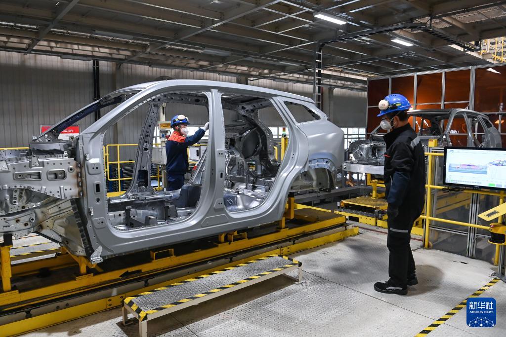 2月26日,工作人员在吉利汽车宝鸡制造基地焊装厂检查车辆零部件。