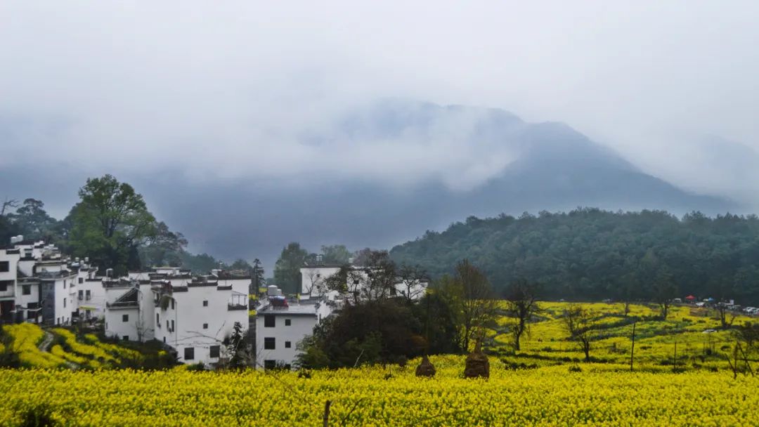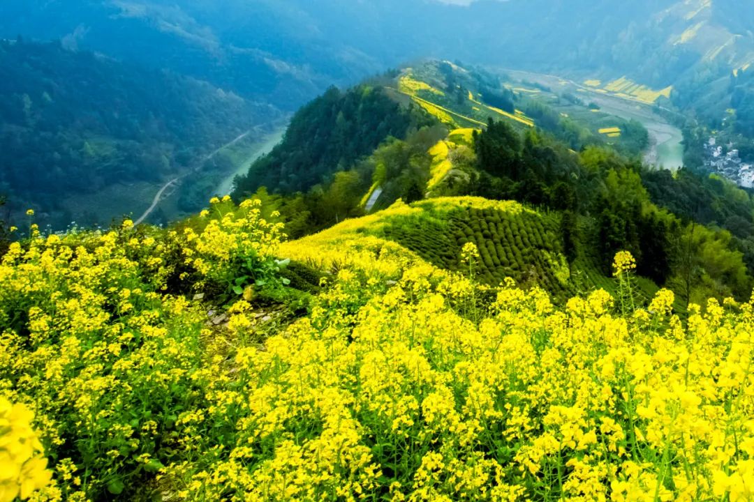 江岭,是中国四大油菜花海之首,属于海拔高山梯田型油菜花,站在高处远眺,万亩梯田里的油菜花竞相绽放,金黄色的油菜花在层层叠叠的梯田中,像波浪一样起伏,还有黑瓦白墙的徽派民居点缀其中,清晨还可以看到晨雾,山间缥缈的薄雾笼罩着油菜花海,真的太美了!
