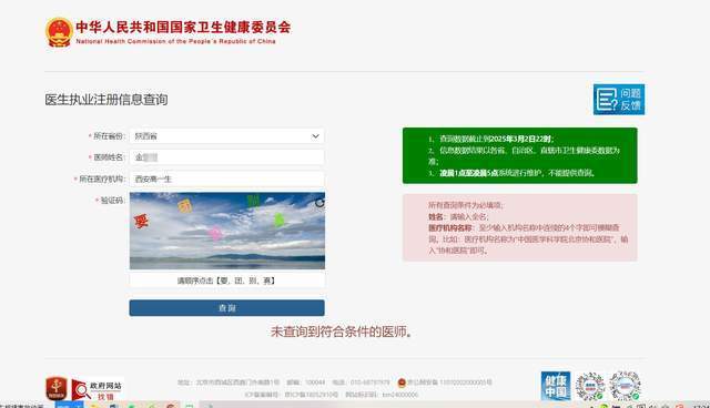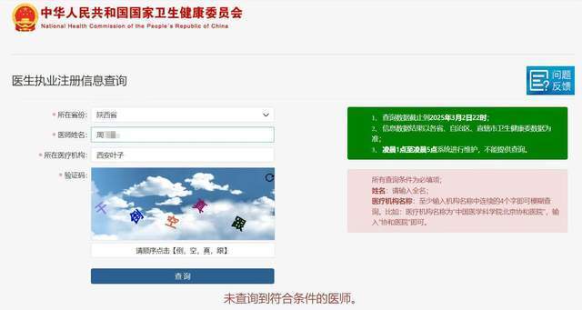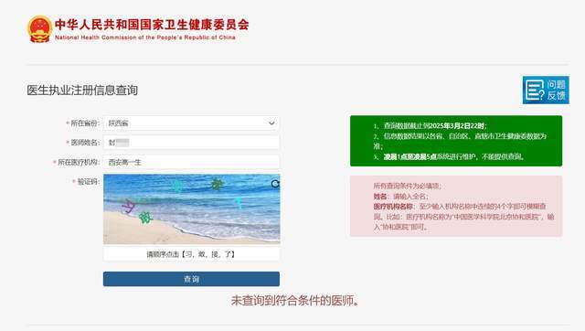 然而,华商报大风新闻记者通过国家卫生健康委员会官网查询,医生执业注册信息查询系统中,西安碑林宇华综合门诊部并无郭某医生资质,郭某名字未查询到符合条件的医师。同时,国家卫健委全国医疗机构查询系统中,也未查询到与“西安新时光”“新时光整形”等相关的医疗机构。而陈某的医生执业注册信息也并非简介上“西安新时光整形医院”“医疗美容外科医生”,其主要执业机构为西安碑林宇华综合门诊部,职业范围为外科专业,并无美容主诊医师专业。