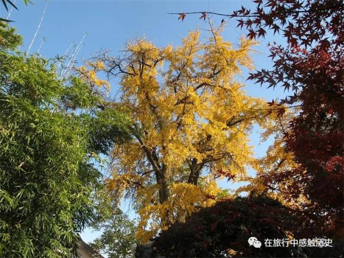 与一般古银杏枝如蠖屈的老态龙钟形象不同,这棵银杏迎风玉立,飘逸洒脱,如同小伙子一般强壮,笔直的树干直冲云天、枝繁叶茂郁郁葱葱,姿态高耸、寇如巨伞。根据树龄推断,这棵银杏是经历过湘军那把一连烧了几日的大火,“十年壮丽天王府”都“化作荒庄野鸽飞”了,而绝地逢生的。