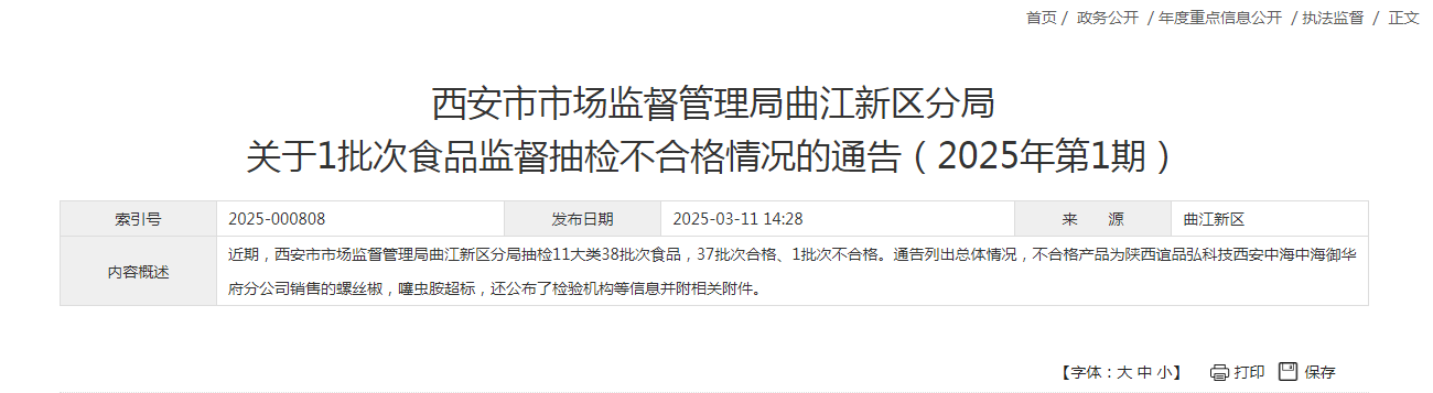 西安市市场监督管理局曲江新区分局关于1批次食品监督抽检不合格情况的通告(2025年第1期)