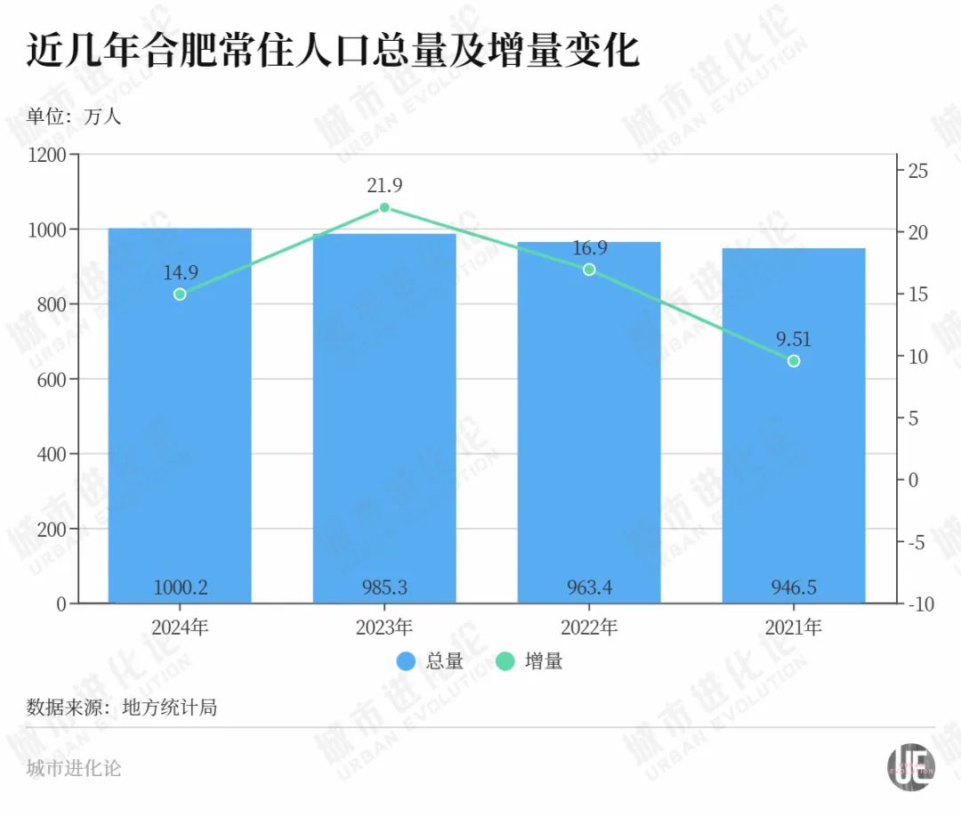 2012年到2024年,合肥常住人口从757.2万人增长到1000.2万,特别是近年加速增长,近三年累计增加超过50万人。其中,绝大部分为外地来肥的迁移人口。