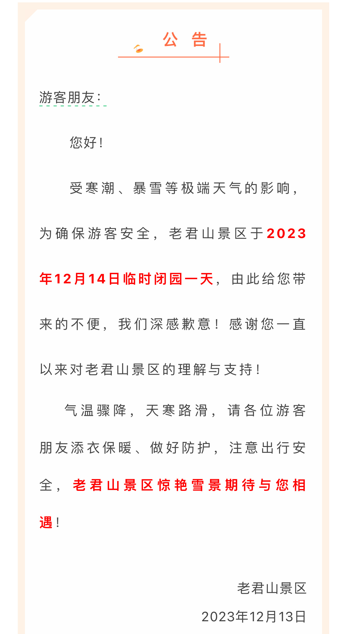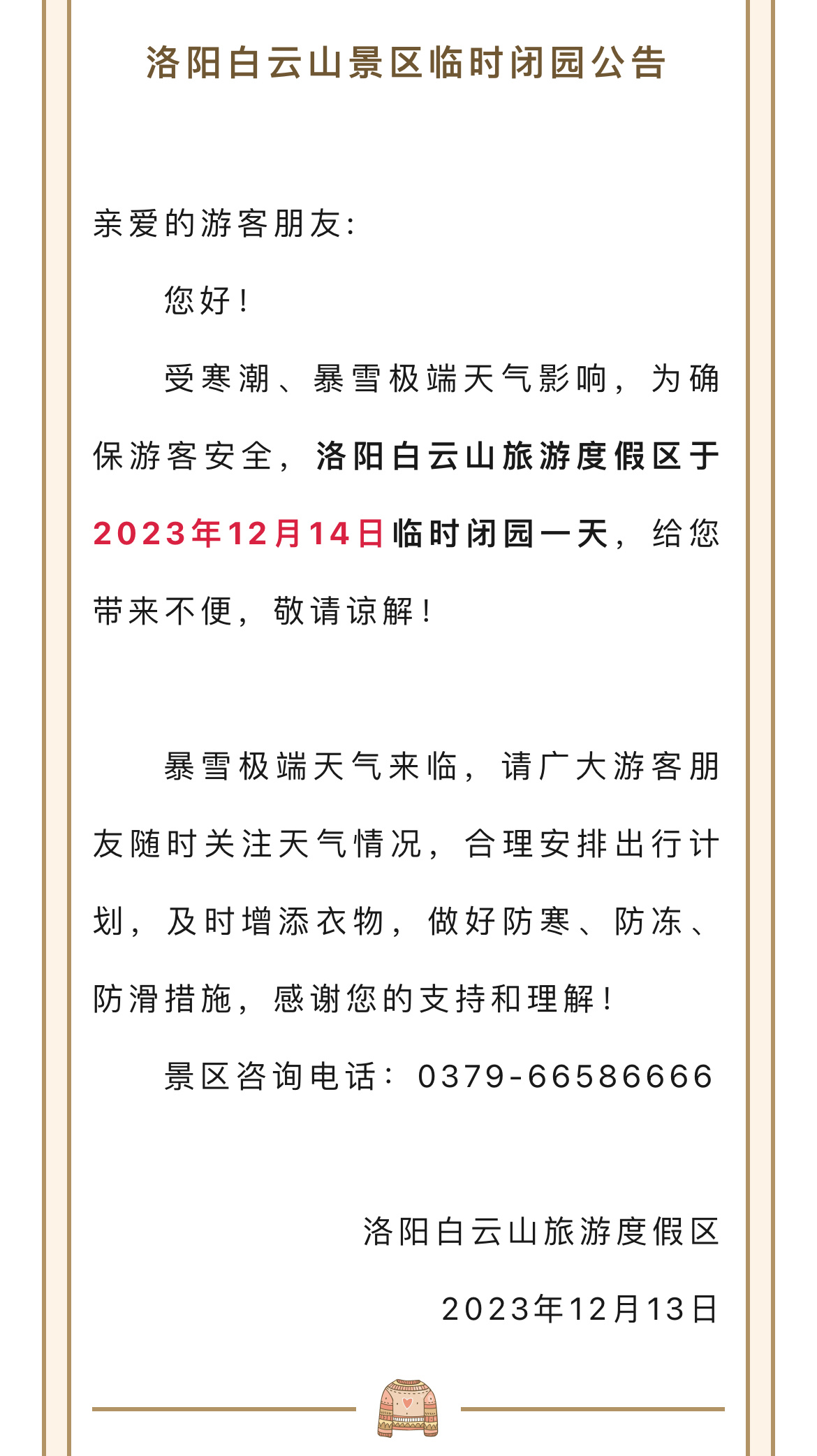为防范应对近期低温雨雪冰冻灾害带来的不利影响,切实保障游客及百姓生命财产安全,洛阳市文广旅局下发紧急通知:要求各县域山水景区自12月13日起立即关停,疏散游客,并及时发布关停公告;要求各城市区景区密切关注天气变化,做好防范应对措施,必要时立即关停景区。