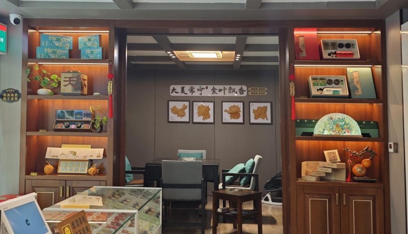 曾经的装修经验成了她的“秘密武器”:景点书签的悬挂高度、展柜灯光的色温设计,甚至店内木艺装饰的榫卯结构,都藏着对美学的探索;玻璃门前张贴着常宁市旅游景点交通路线,悬挂着一叠叠景点书签,正面是塔山瑶乡的云海、百万樱花园的花海,背面印着交通路线、景点开放时间等旅游攻略;礼盒展墙上,“印象常宁”系列以印山大印为灵感,融合塔山茶叶、印章和版画,成为游客争相收藏的“特色伴手礼”。