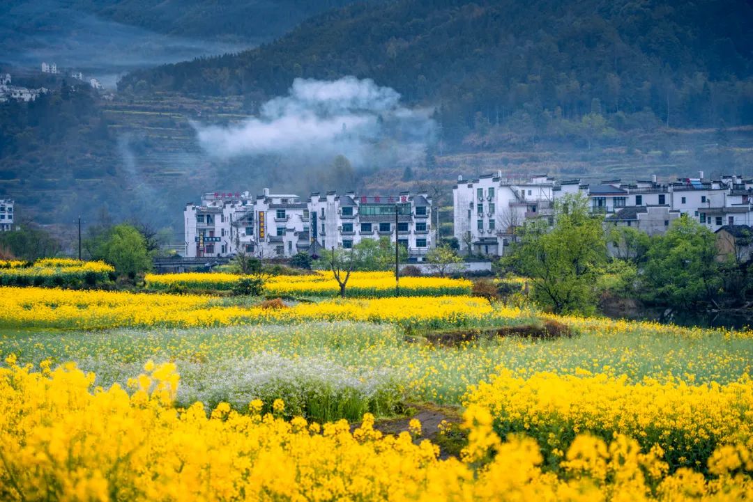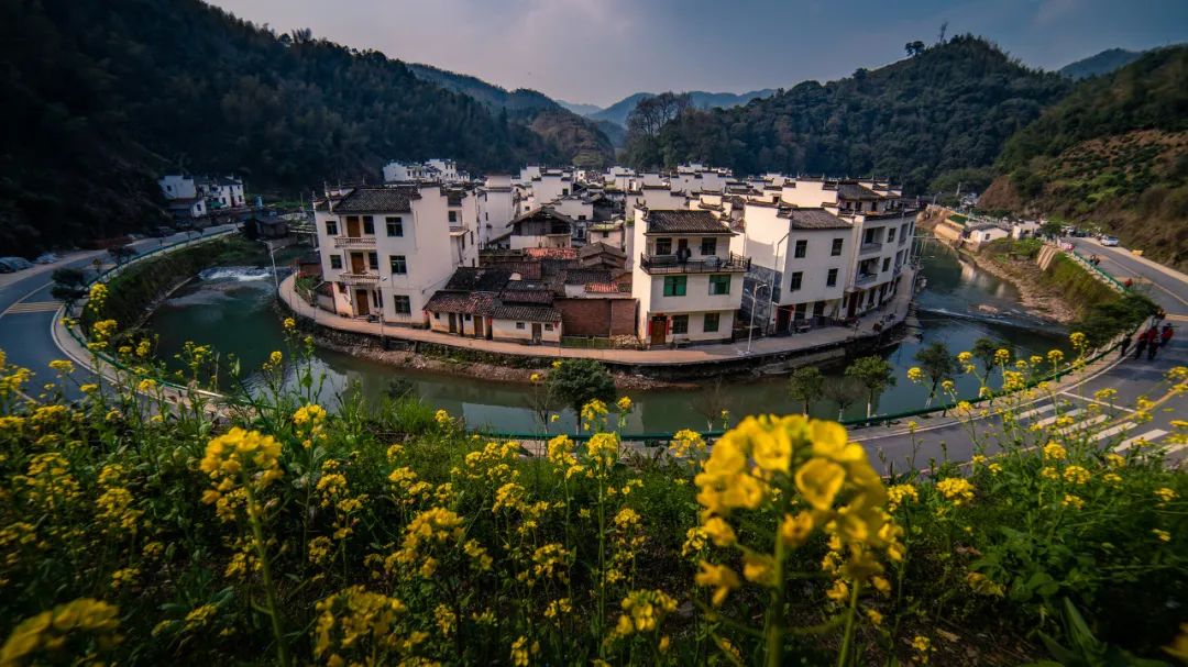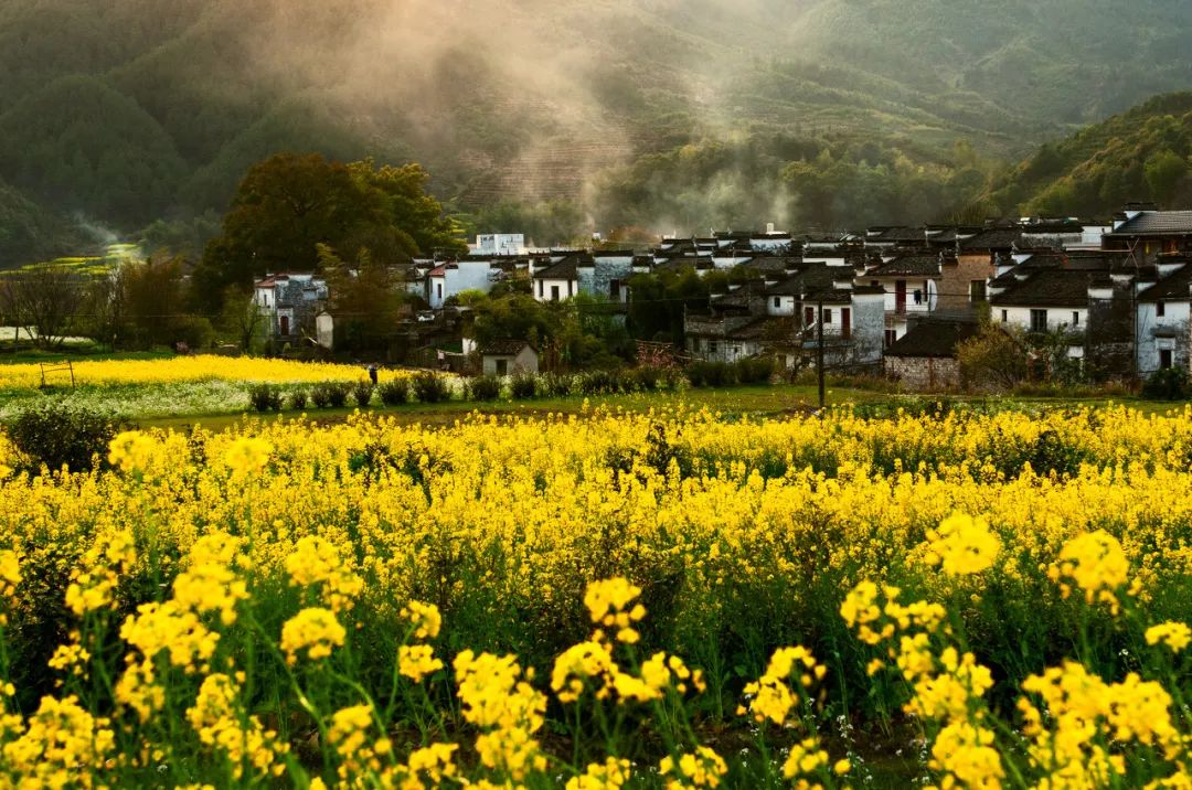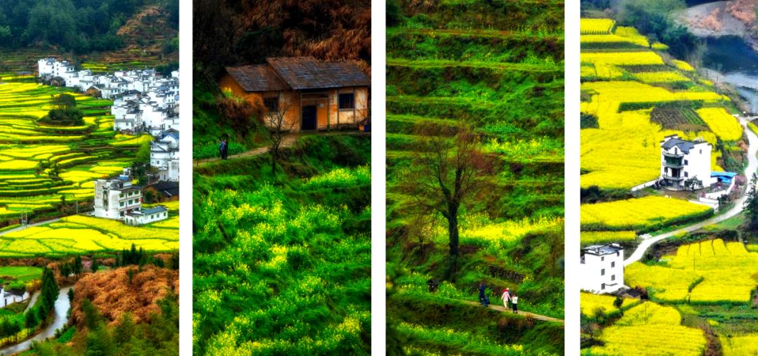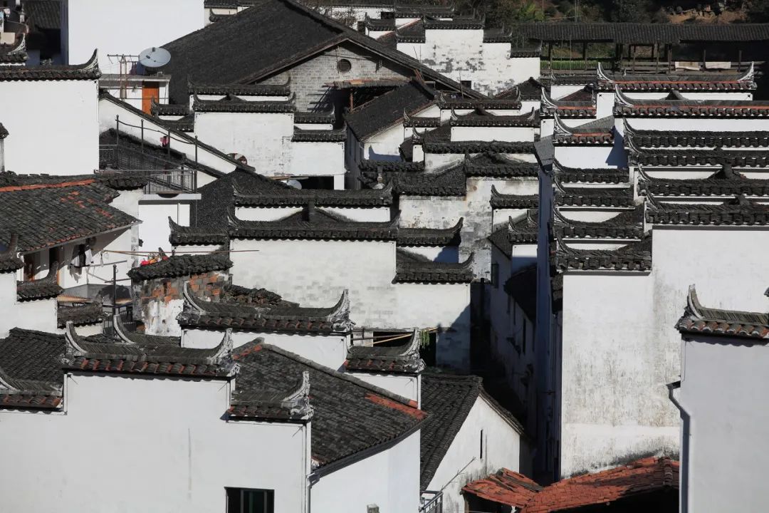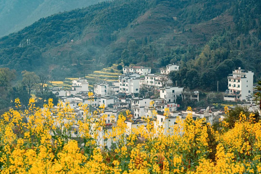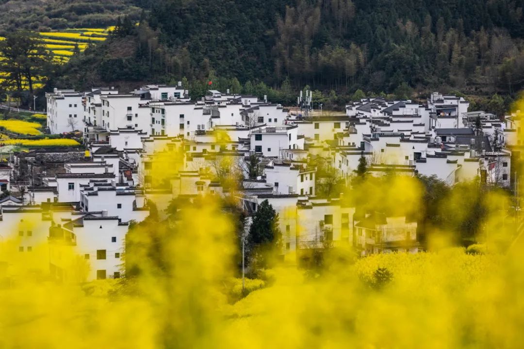 黑瓦白墙的徽派民居夹杂在一片金黄之间