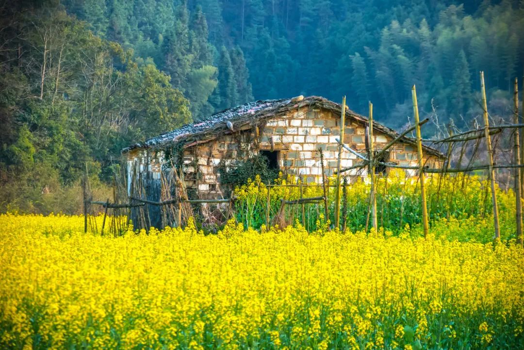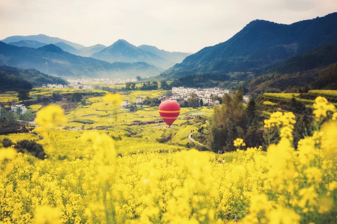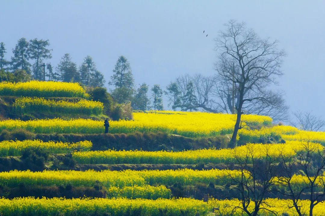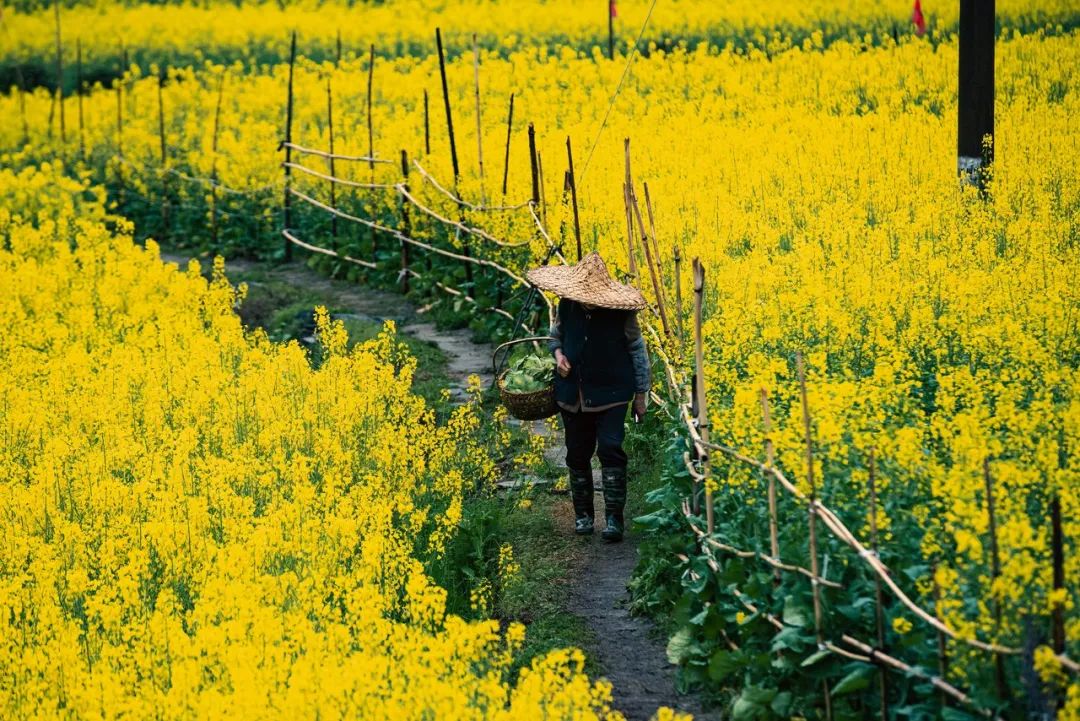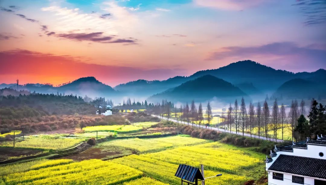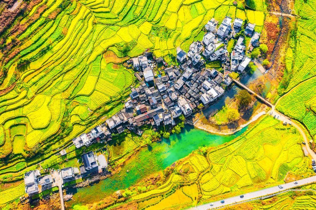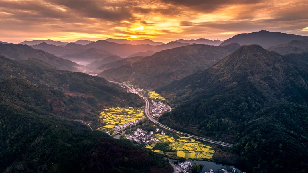 黑瓦白墙的徽派民居夹杂在一片金黄之间