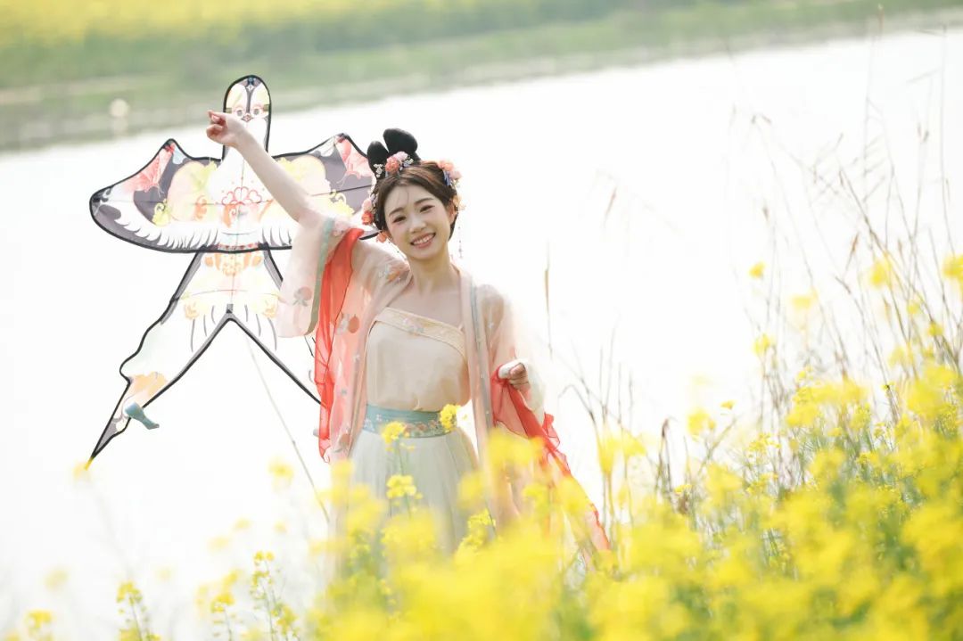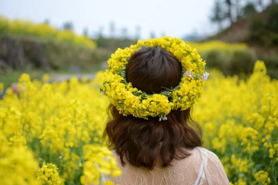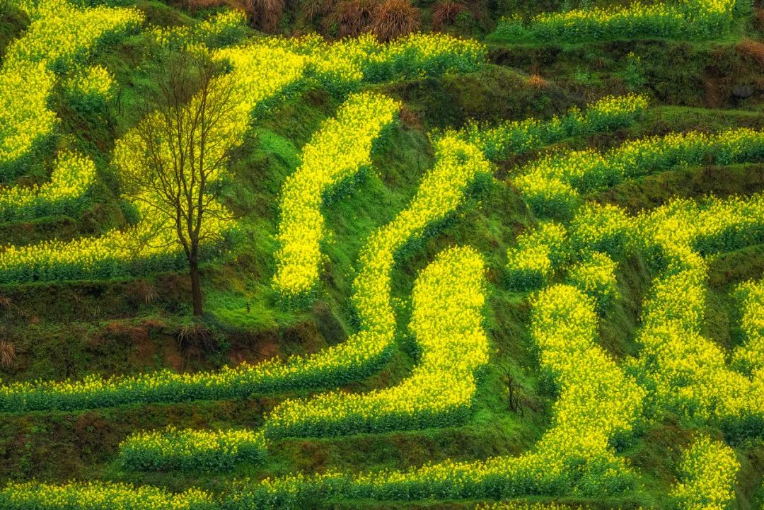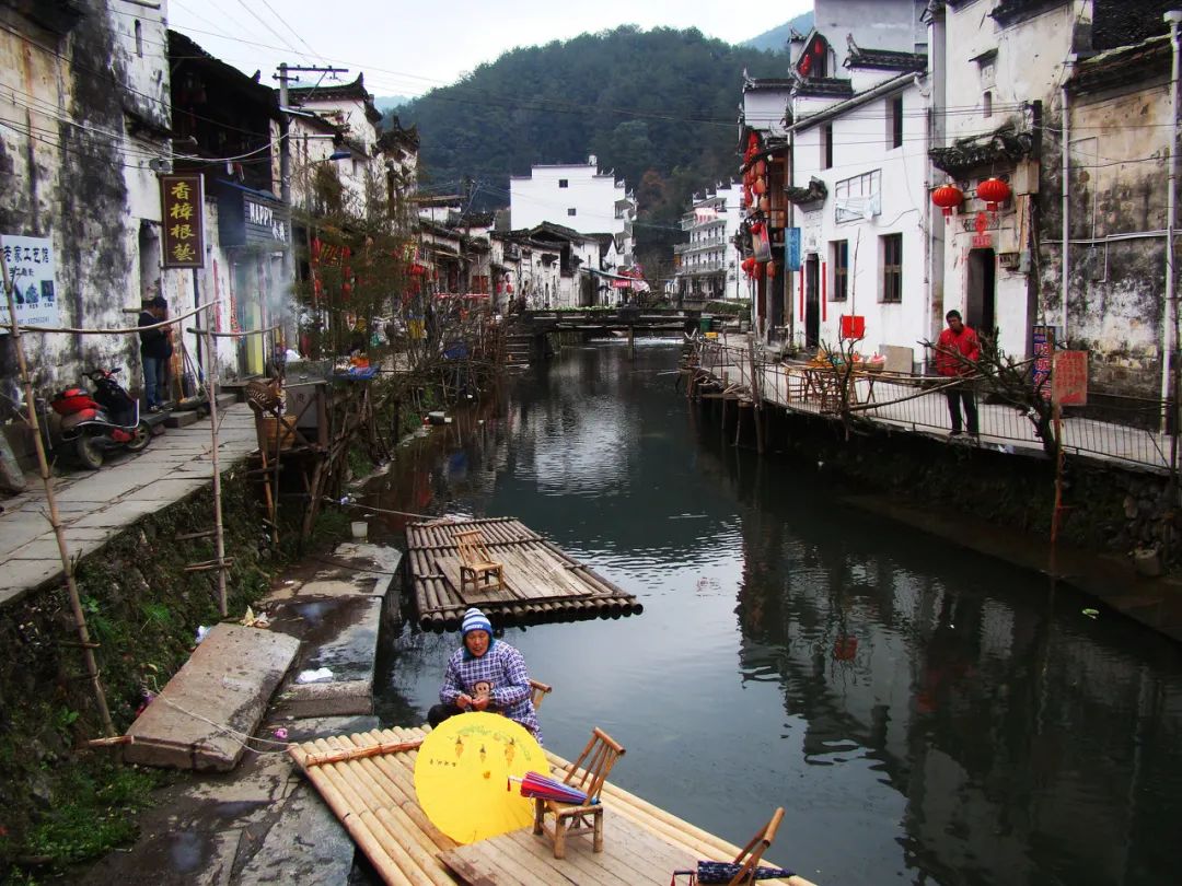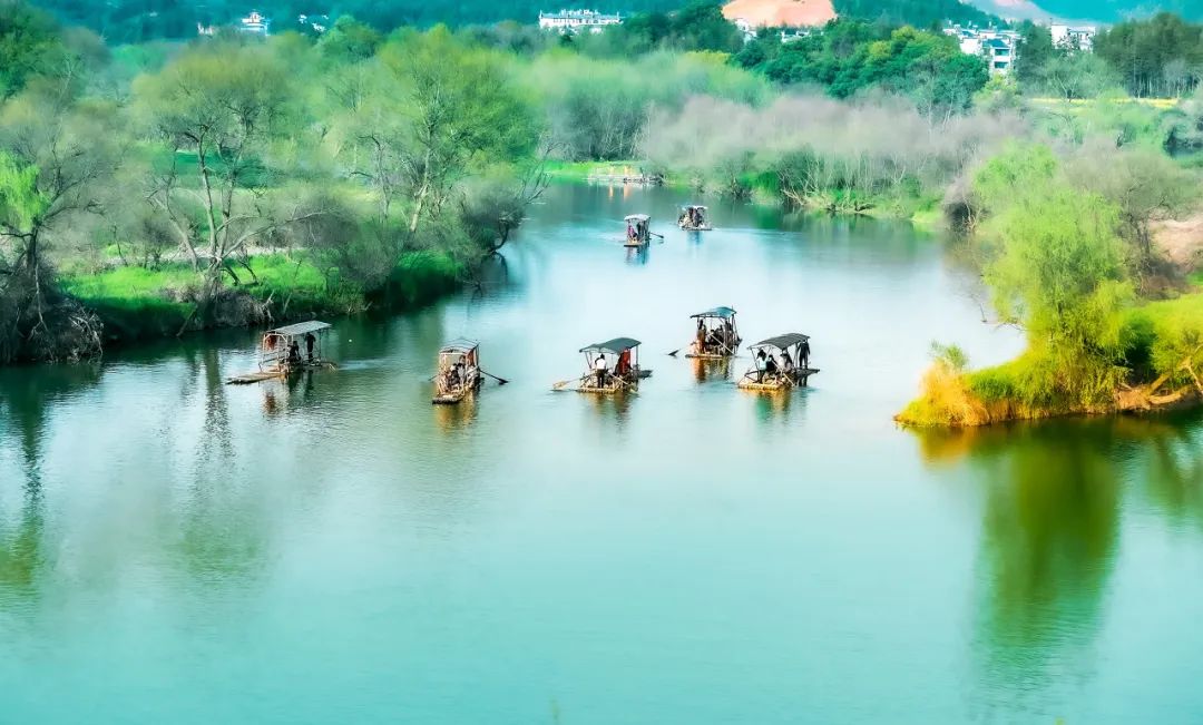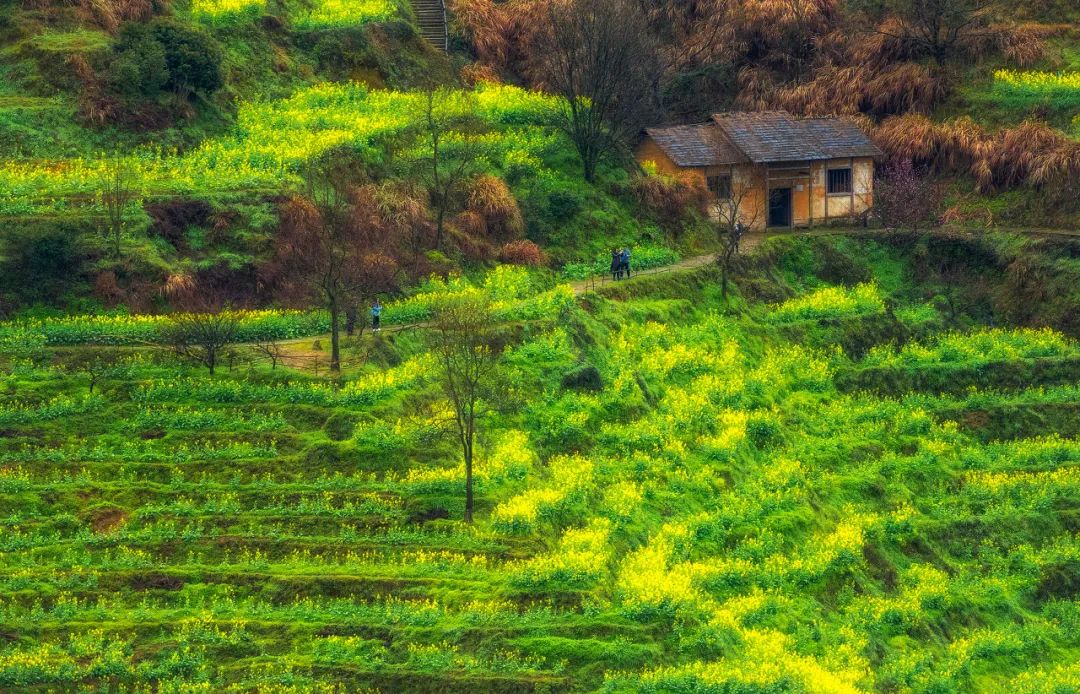 黑瓦白墙的徽派民居夹杂在一片金黄之间