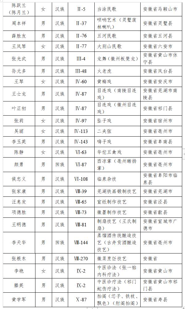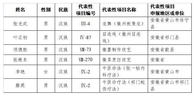 文化和旅游部日前公布第六批国家级非物质文化遗产代表性传承人名单,安徽省共有 24 人入选。其中,黄山市有6位传承人上榜,上榜总人数位列全省第一,涉及的非遗项目有龙舞(徽州板凳龙)、目连戏(徽州目连戏)、 徽墨制作技艺、徽菜烹饪技艺、中医诊法(张一帖内科疗法)和中医诊疗法(祁门蛇伤疗法)。