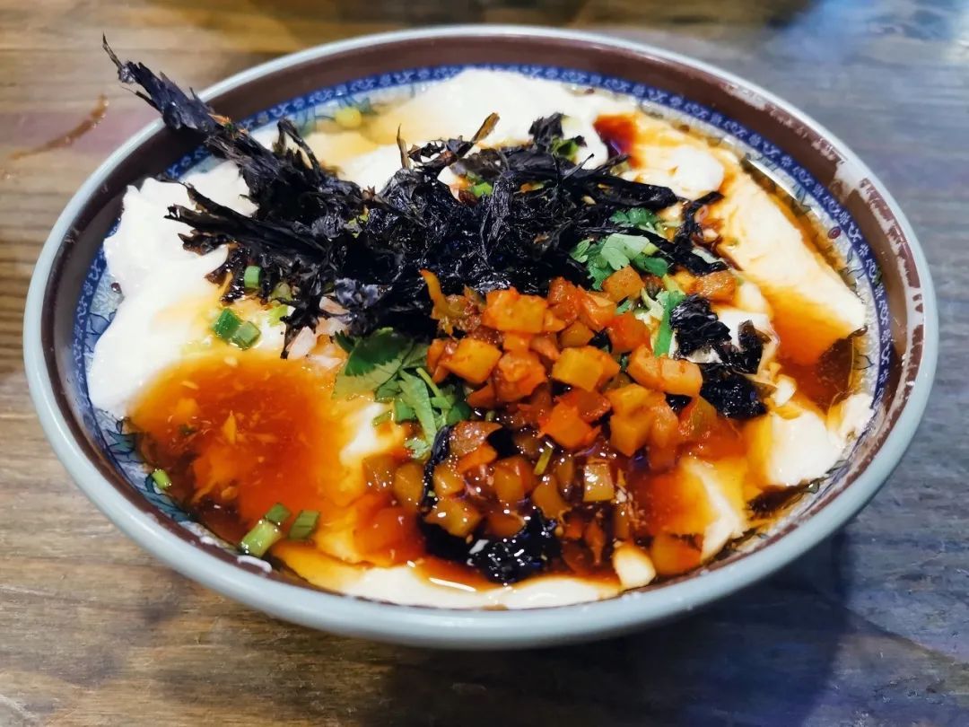 一碗光滑的“白色豆腐”,色泽洁白,滑嫩爽口,鲜咸微甜,还加了不少紫菜、虾仁、榨菜等,自己动手拌一拌,好吃!