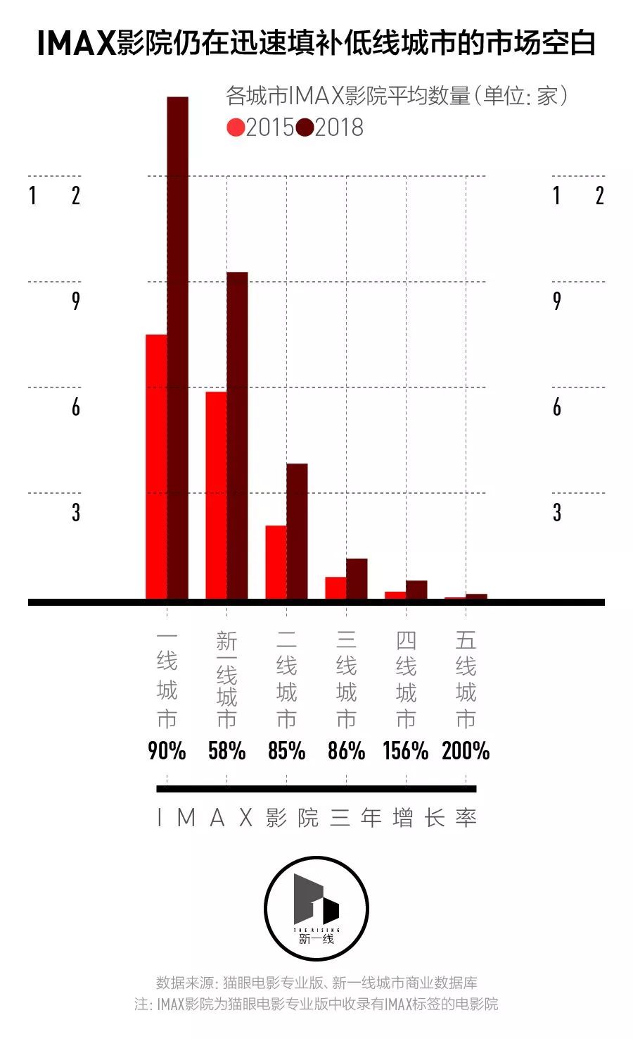 当然有钱自然不愁花不出去。来自猫眼的数据显示,随着电影市场下沉,IMAX影院的增长明显出现了向四五线城市下沉的趋势,这两个级别城市的三年增长率都超过了100%。
