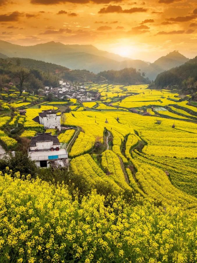 婺源的油菜花会从三月一直开到清明,婺源的油菜花太美了,一到春天,层层叠叠的梯田开满油菜花,明黄的油菜花映衬着白墙黛瓦。