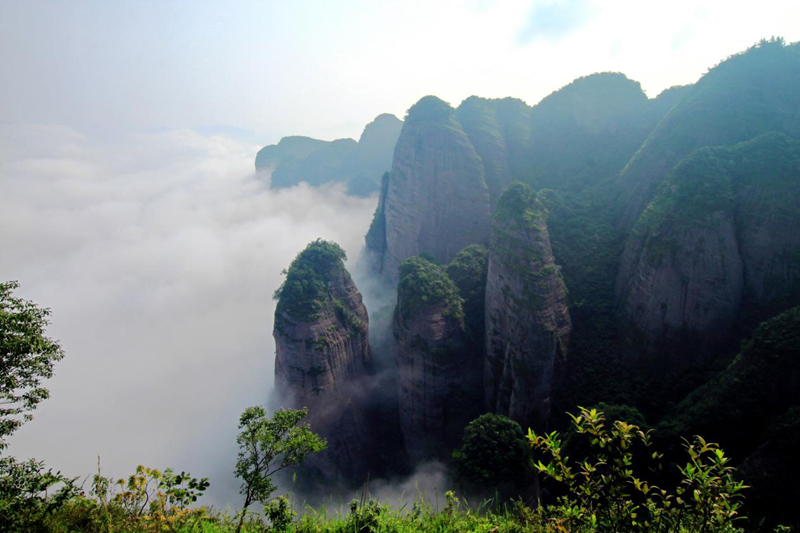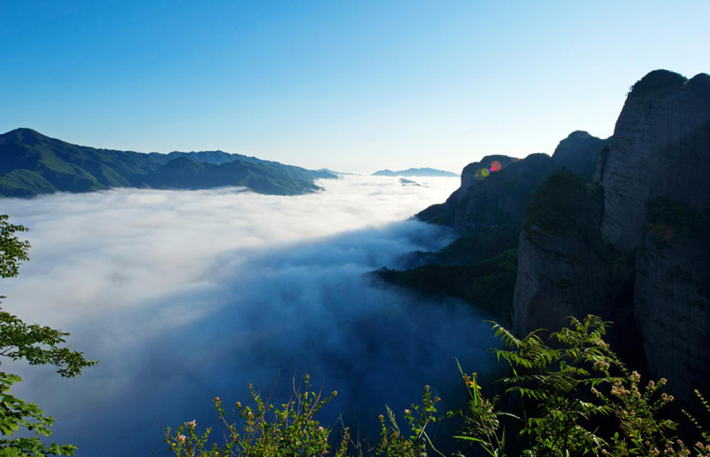 云海日出 独特的地形和多变、湿润的气候,造就了本区壮观的云雾霞光,最迷人之处在于时而似万马奔腾,时而浓雾空朦,时而薄雾如纱的云海之上,一轮红日斜挂,此景此情,催人奋进。