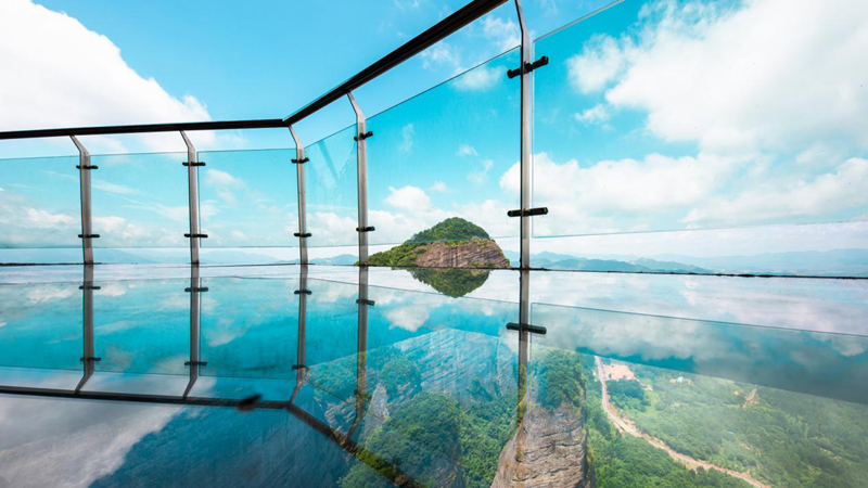云边栈道 依附于武当山边缘修筑有 219 多米玻璃栈道,栈道紧贴峭壁,在悬崖之上凌空蜿蜒穿行,步步惊心,脚下就是绝壁天险、万丈悬崖。