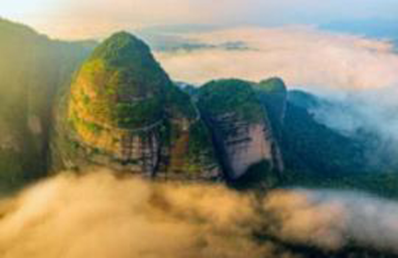这里的山峰形成于两亿年前的中生代地壳频繁的运动,主要为红砂岩、砾砂岩等,经地壳运动抬升、长期风化剥离和流水侵蚀,形成孤立的山峰和陡峭的奇岩怪石,是巨厚红色砂、砾岩层中沿垂直节理发育所形成的典型丹霞地貌,主峰海拔864米。