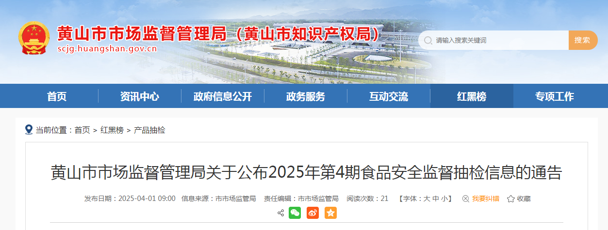 安徽省黄山市市场监督管理局关于公布2025年第4期食品安全监督抽检信息的通告