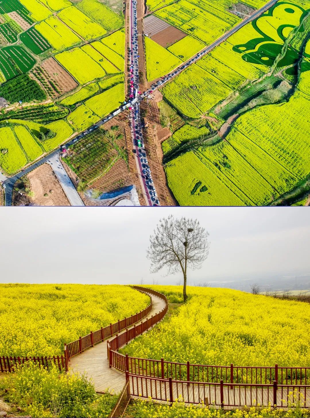 襄城县的万亩油菜花海,金浪翻滚,与古朴的村落相映成趣,勾勒出田园牧歌的浪漫。