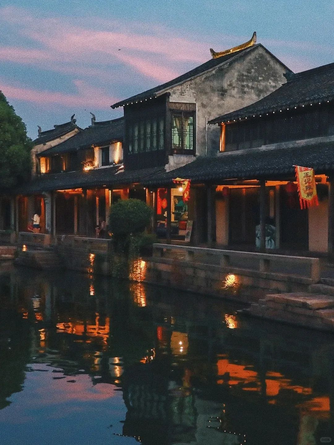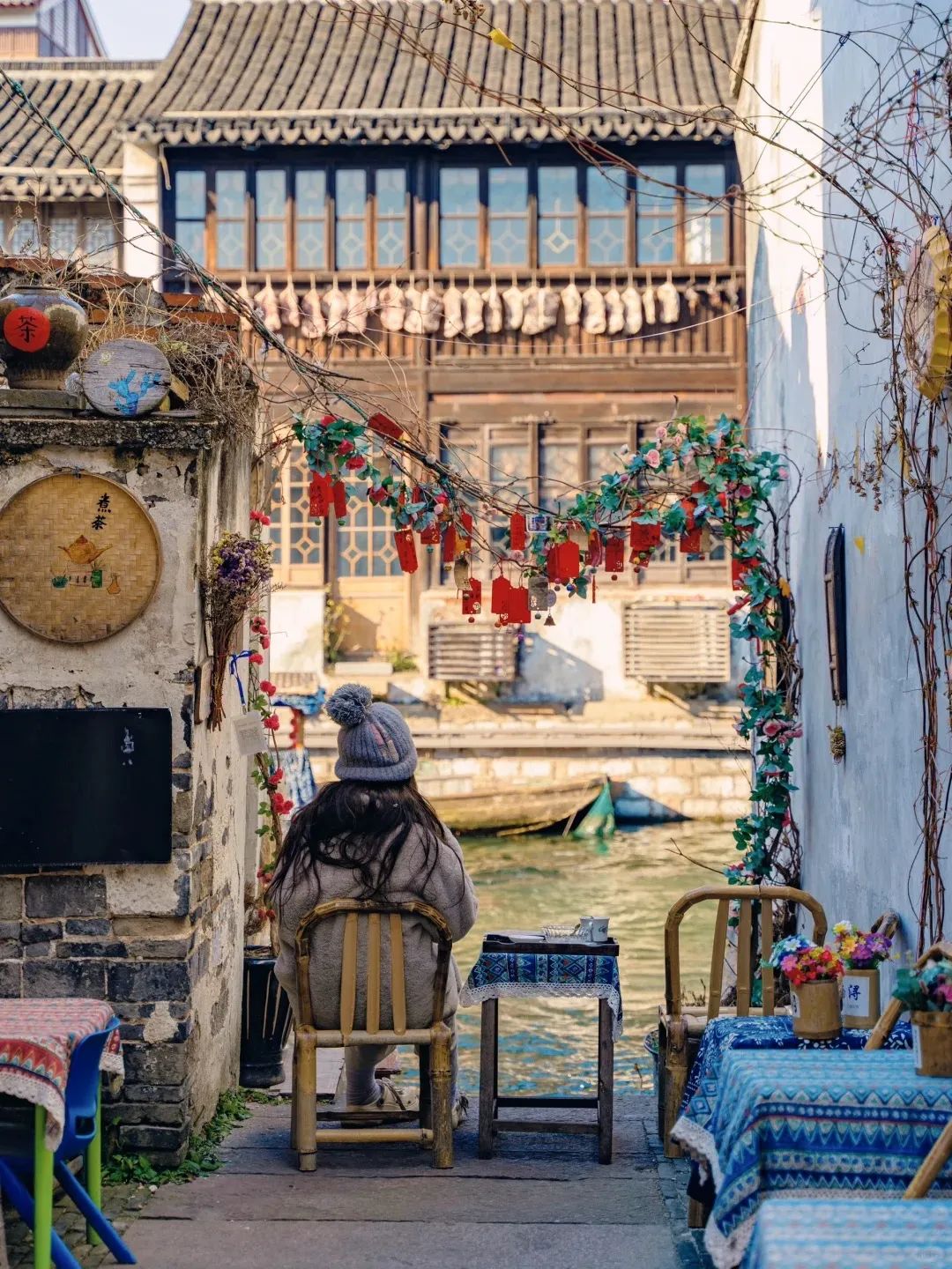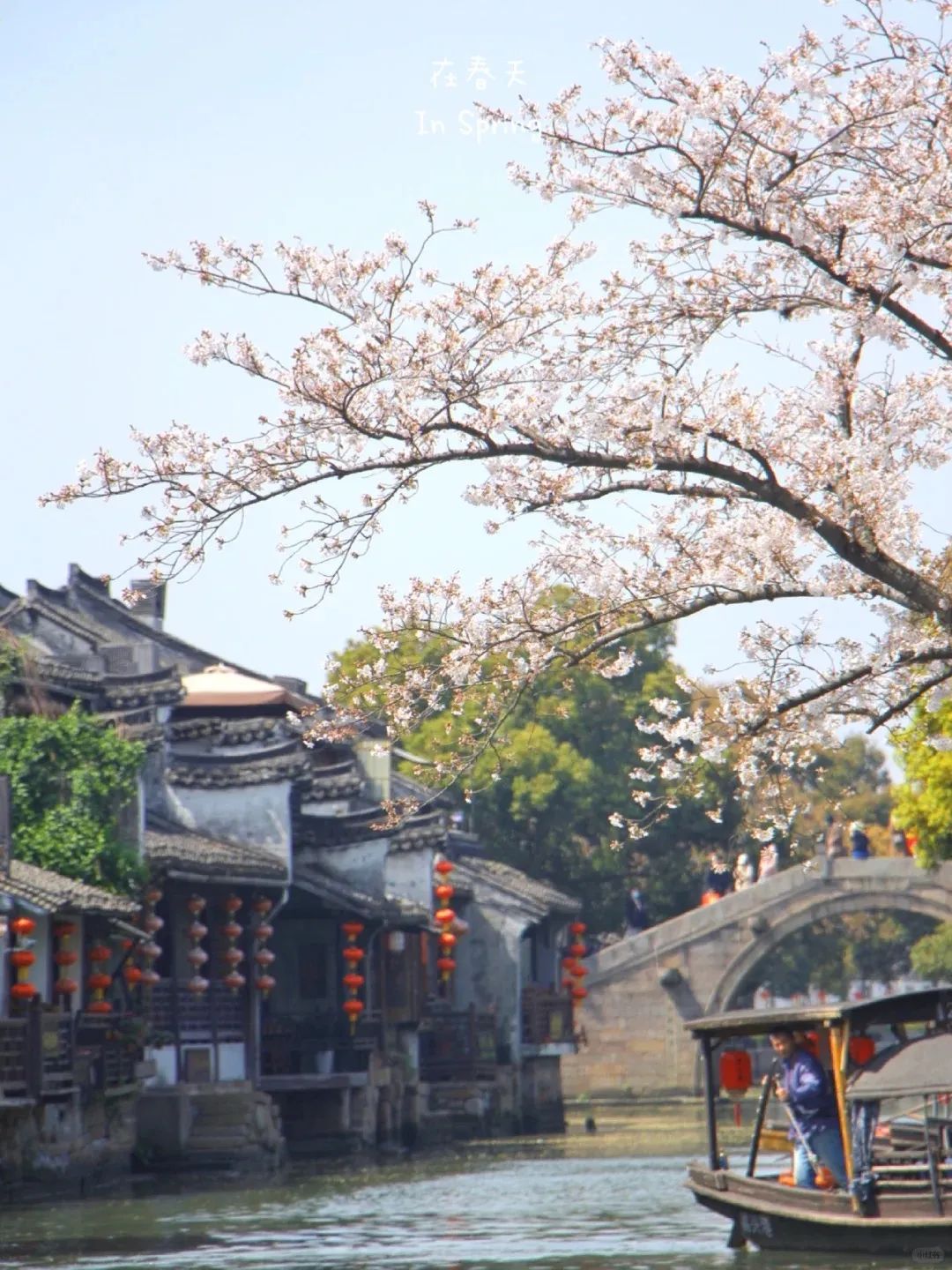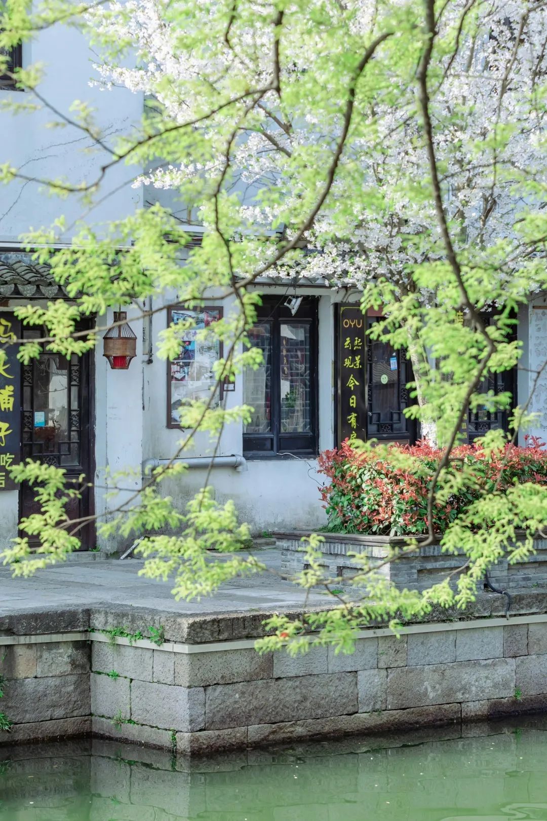 当黄昏的余晖洒向的古老的百间楼,春日的鲜花探于白墙黛瓦间,一旁的摇橹船和红灯笼,把柔情水乡的烟火也勾勒而出,太迷人了。