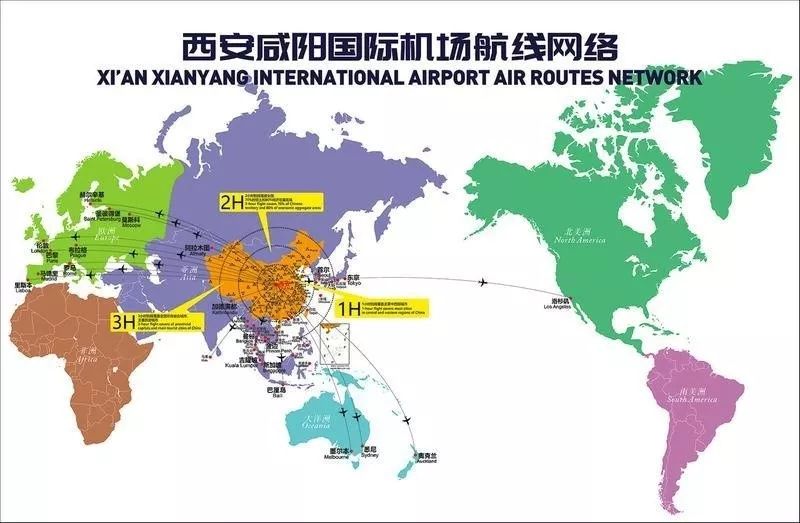 从西咸机场出发,1小时航程可以覆盖主要的中西部城市,2小时航程可以覆盖中国75%的领土和85%以上的经济资源,3小时航程便能覆盖全国所有的省会城市和重要旅游城市。