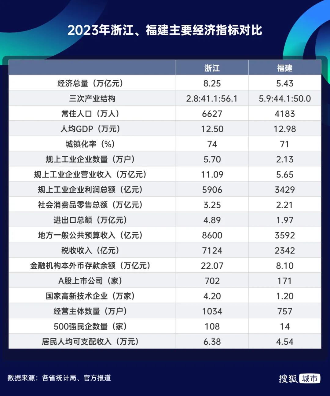 对比浙闽两省2023年主要经济数据可以发现,无论是经济总量、人口规模、工业实力、消费外贸,还是财政收入、资金总量、企业质量、人均收入,浙江都要优于福建。