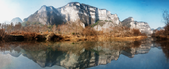 湄江风景区拥有一代帝陵、二湖秀水、三道岩门、四片绿洲、五座寺庙、六大飞瀑、七里峡谷、八面险景、百个奇洞、千块巧石、万树腊梅等景观。十里画廊,壁立千仞,再加上存水的衬托,形成一幅五彩缤纷的景色,颇有桂林山水之秀丽,因而此地也被称为“小桂林”。