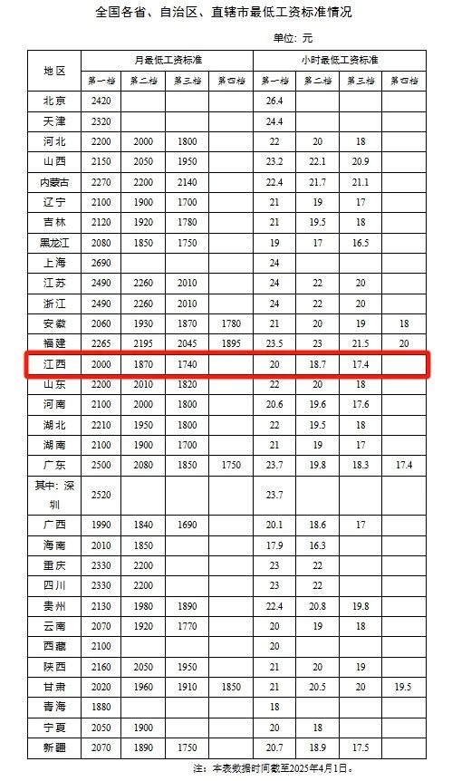 数据显示,目前有21个省份,第一档月最低工资标准,在2100元及以上。有8个省份,第一档月最低工资标准,达到或超过2300元。江西省第一档月最低工资标准为2000元,第一档小时最低工资标准为20元。