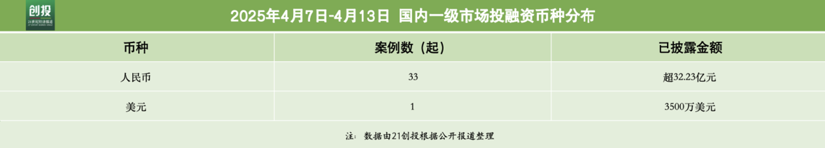 21创投不完全统计,4月7日—4月13日,报告日期内国内一级市场发生融资事件41起。其中,有34笔融资披露了融资金额和币种信息,总规模超人民币34.68亿元。