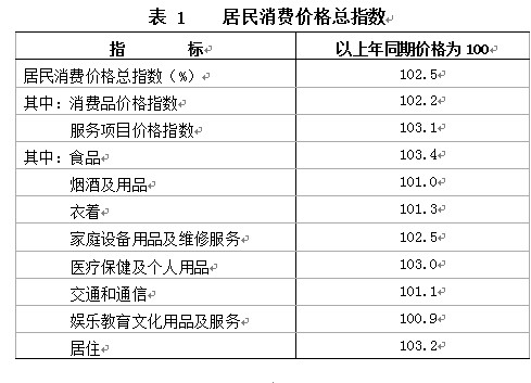 价格指数:全年居民消费价格比上年上涨2.5%,其中消费品价格上涨2.2%,服务项目价格上涨3.1%(见表1)。工业生产者出厂价格比上年下降2%。工业生产者购进价格比上年下降2.3%。
