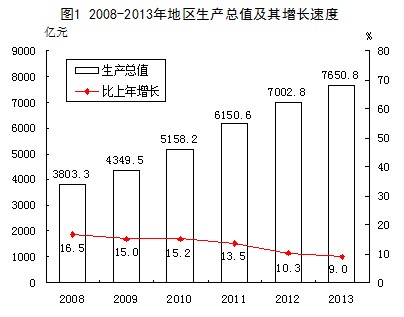 经济总量:初步核算,全年地区生产总值【1】7650.8亿元,比上年增长9.0%。其中,第一产业增加值477.6亿元,增长4.8%;第二产业增加值3892亿元,增长9.4%;第三产业增加值3281.2亿元,增长9.1%。三次产业结构由上年的6.4:51.9:41.7调整为6.2:50.9:42.9,对经济增长的贡献率分别为3.2%、55.4%和41.4%。人均生产总值110600元,按年末汇率折算为18140美元。