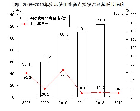 利用外资:全年新批准外商投资企业240家,注册外资金额111.14亿美元。新批投资总额1000万美元以上的外资项目51个,其中投资超亿美元的项目12个。新引进世界500强投资项目11个。实际使用外商直接投资136亿美元,比上年增长10.12%。香港、日本、韩国、英属维尔京群岛、美国分列实际投资来源地的前5位。